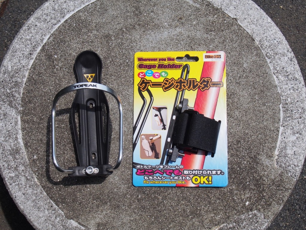 左は先ほど紹介したサイズ可変のボトルケージ「トピーク モジュラー ケージ Ⅱ」、そして右は「Bikeguy どこでもケージホルダー(単品)」です。