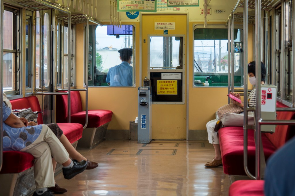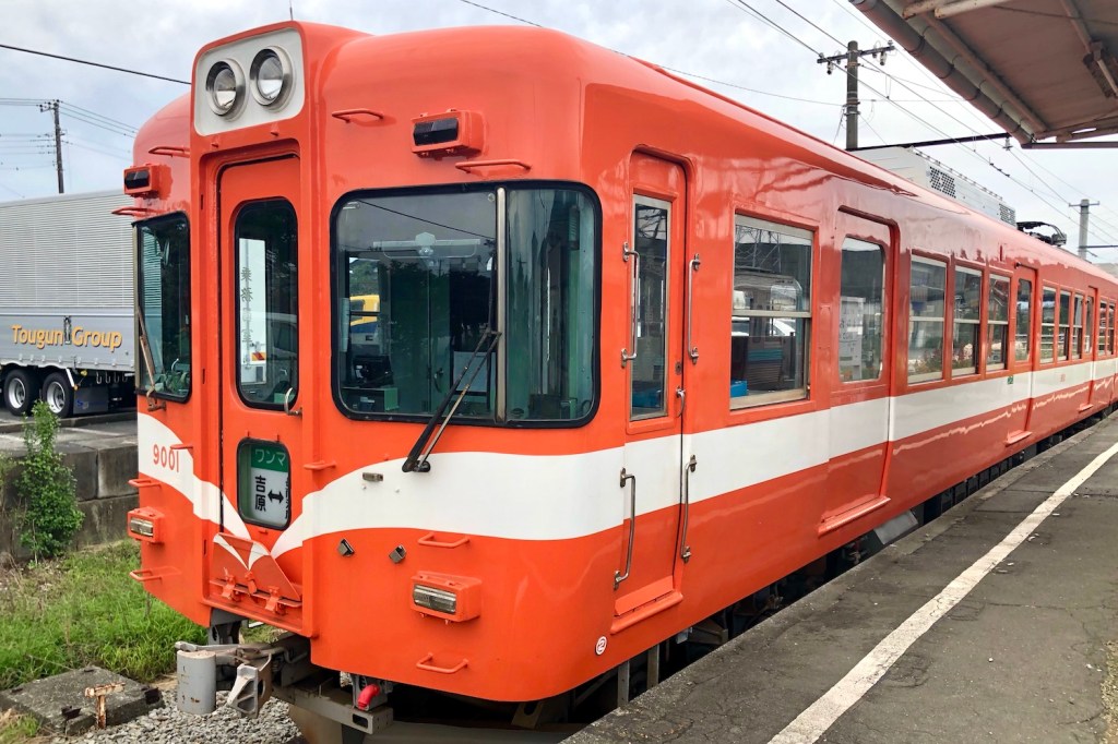 その、元井の頭線の車両に乗る。車内は確かに、ちょっと前までの井の頭線そのものといった感じ。ただし1両編成(単行)で、住宅や製紙工場のあいだを縫うようにのんびりと走るその光景は、井の頭線と大きく違う。
