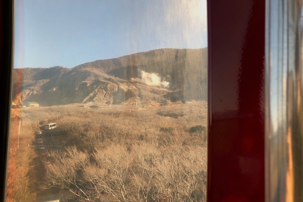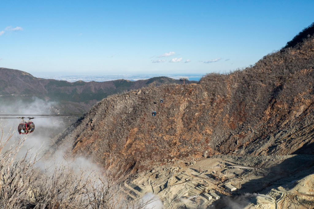 ロープウェイは足元まで窓ガラスがあって、大涌谷の様子を覗き込むことができる。また、早雲山に向けて降り始めるときの相模湾方面の眺望が素晴らしい。約8分で早雲山駅到着。