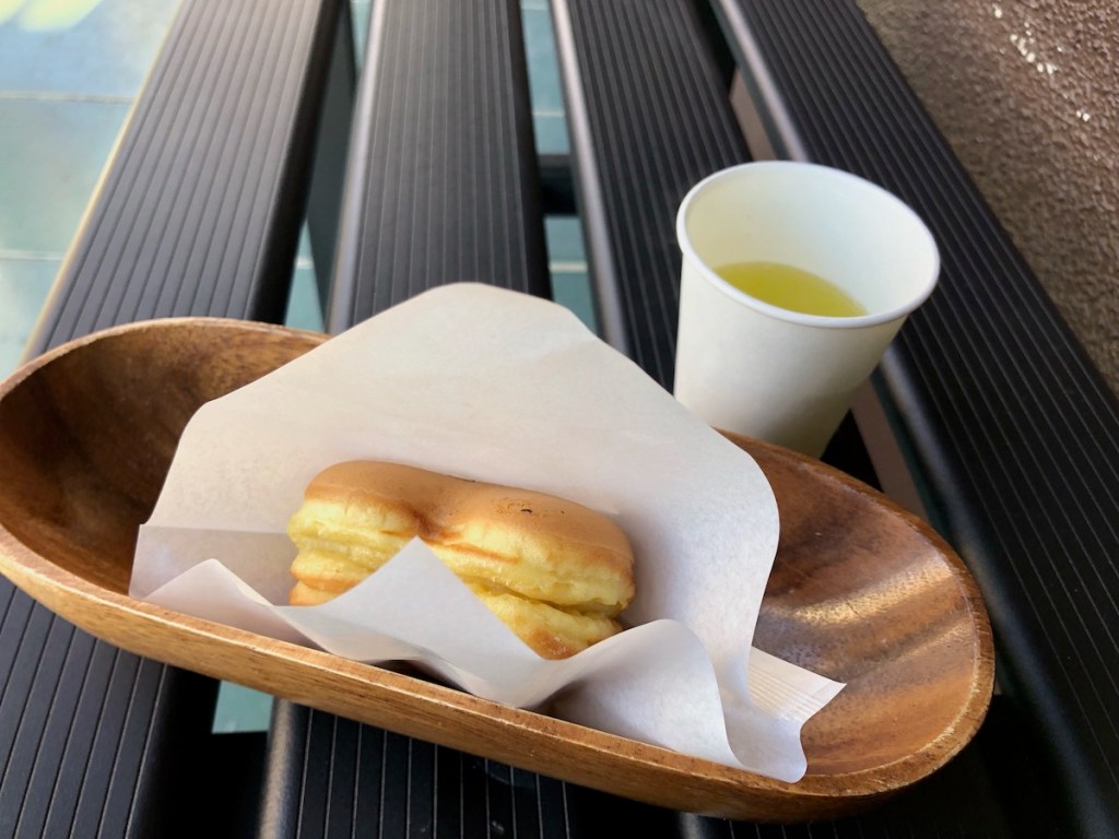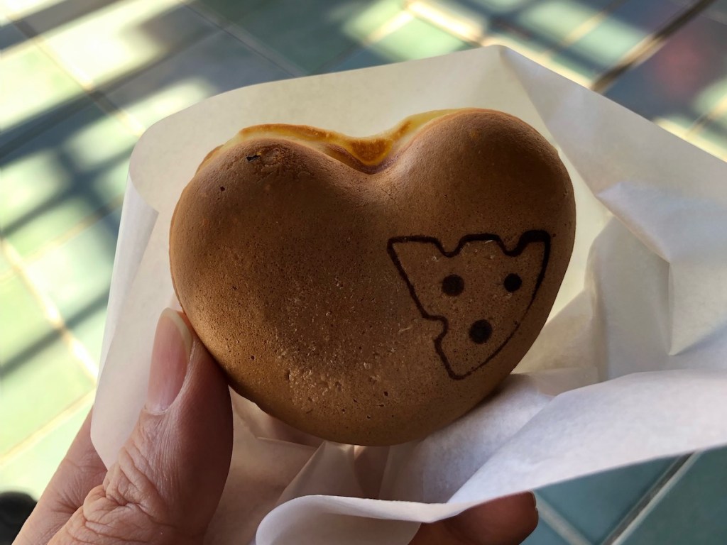 46歳男性ソロ客だが、「あしのこ茶屋」のベンチで「縁結び焼き(小倉チーズ)」を食べる。ハート形の大判焼き。中身は暖かいので、フリーのお茶とともに助かった。1個200円。