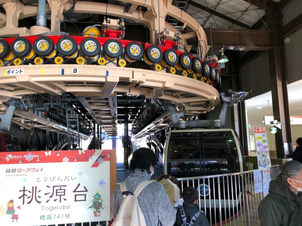 もちろん、箱根ロープウェイの乗り場へ即移動。少し並んで、14:04頃にロープウェイに乗ることができた。