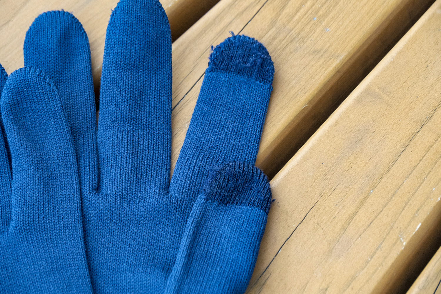 こちらはモンベルの「ジオライン L.W.グローブ」。使いはじめて少し時間が経っているので、そこそこ毛羽立っていたりほつれたりするのは、ご勘弁を。