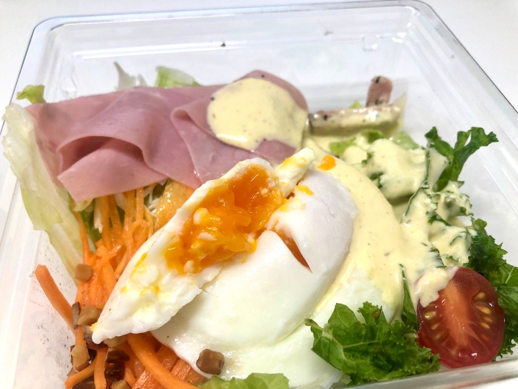 野菜と卵、そしてハムやベーコンなどを一度に摂ることができるサラダです。コンビニサラダとしては見た目がおしゃれとは言えそうですね。とくに卵がいい感じ。クリーミーハーブドレッシングなるものが添えられています。