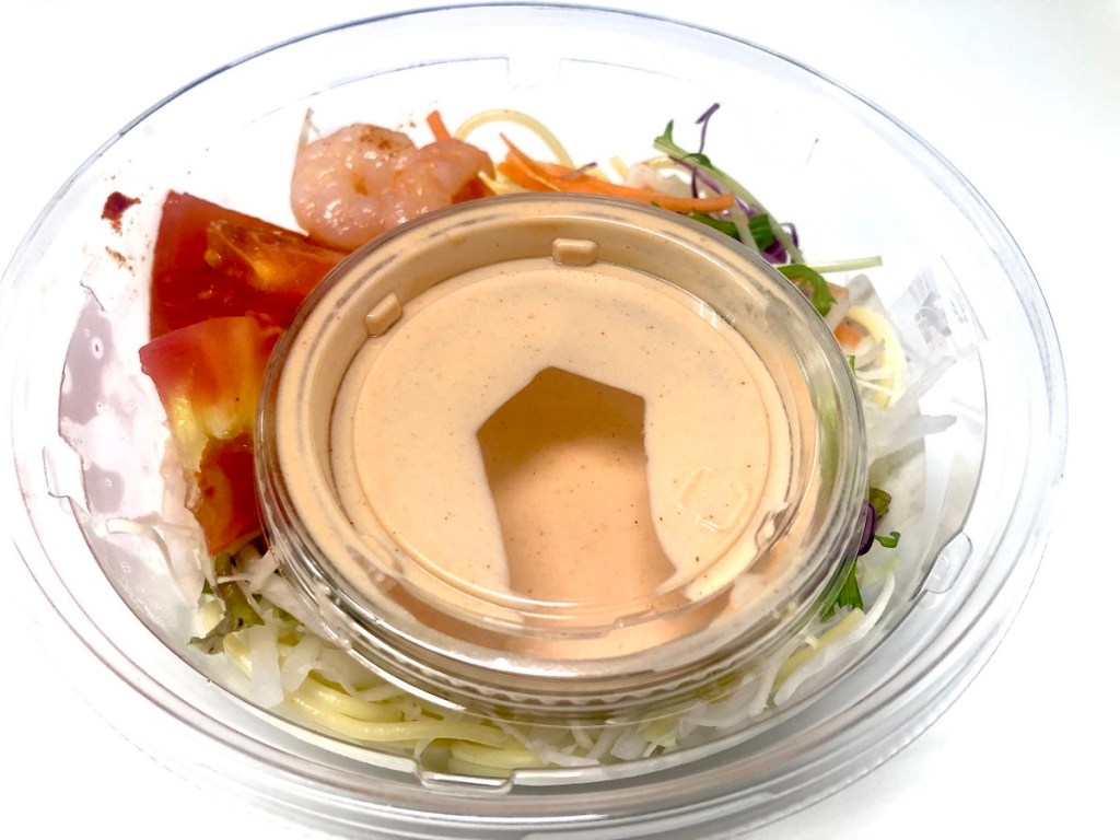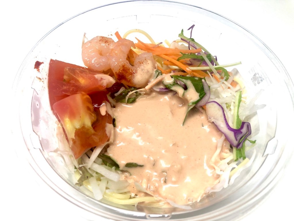 ほのかな酸味のサウザンアイランド“風”ドレッシングはパスタや野菜とよく合っていて、トータルではおいしくいただけるパスタサラダです。海老の代わりにトマトが増量されてたら、リピートなんだけどなぁ。