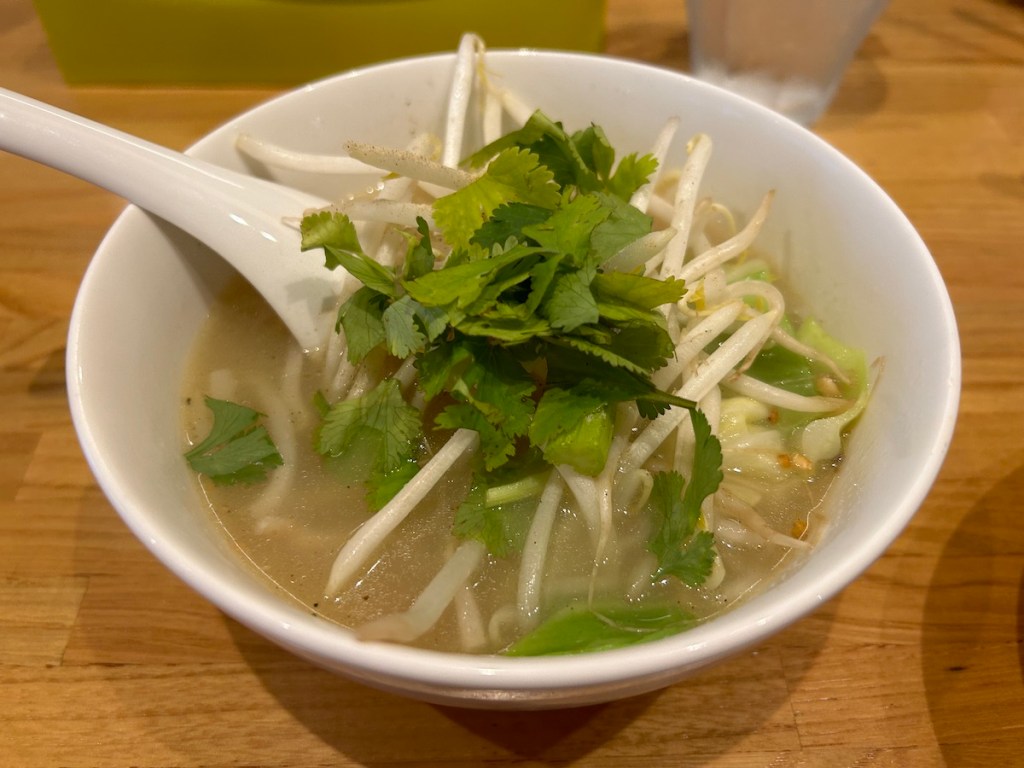 そして、レック麺のプチサイズ。こちらも鶏のスープです。ナンプラー、酢、唐辛子、砂糖で味変を楽しめます。
