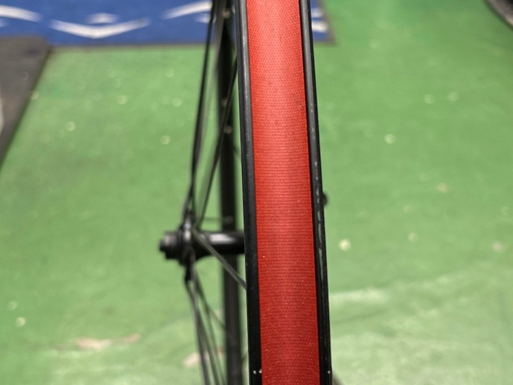 こちらが、リムテープが劣化した様子(色は無視してください、単にリムテープの色が違うだけです)。リムの穴がくっきり見えていますね。