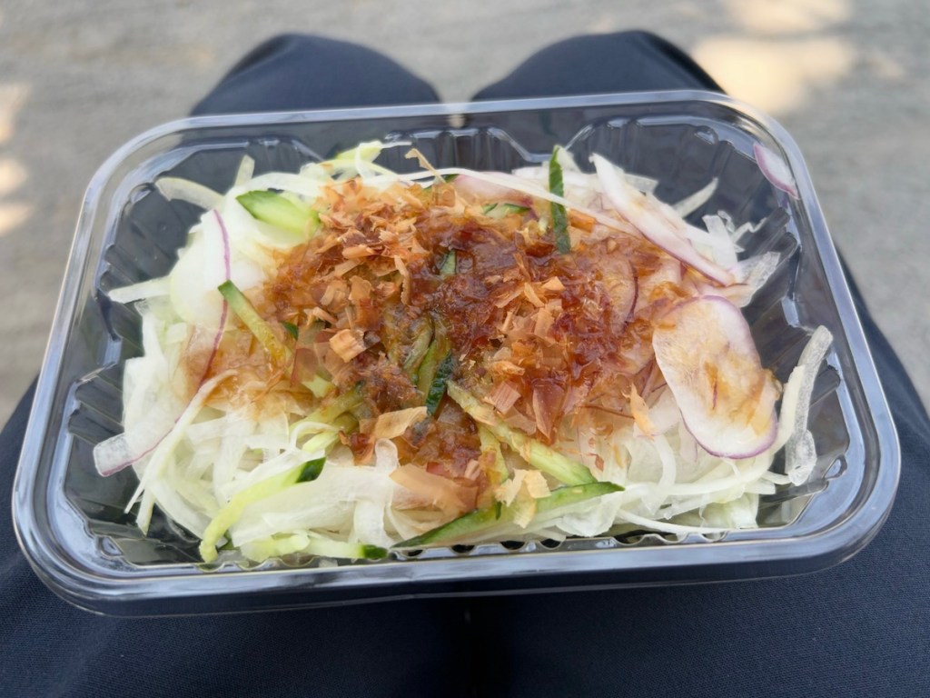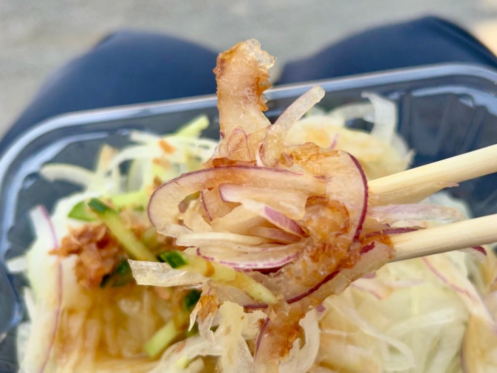 玉ねぎ、紫玉ねぎ、きゅうり、レタスが結構たっぷり入っており、意外と食べ応えがあるサラダだ。ドレッシングが染み込めば玉ねぎの辛さもほどほどに和らいで、最後までおいしい。