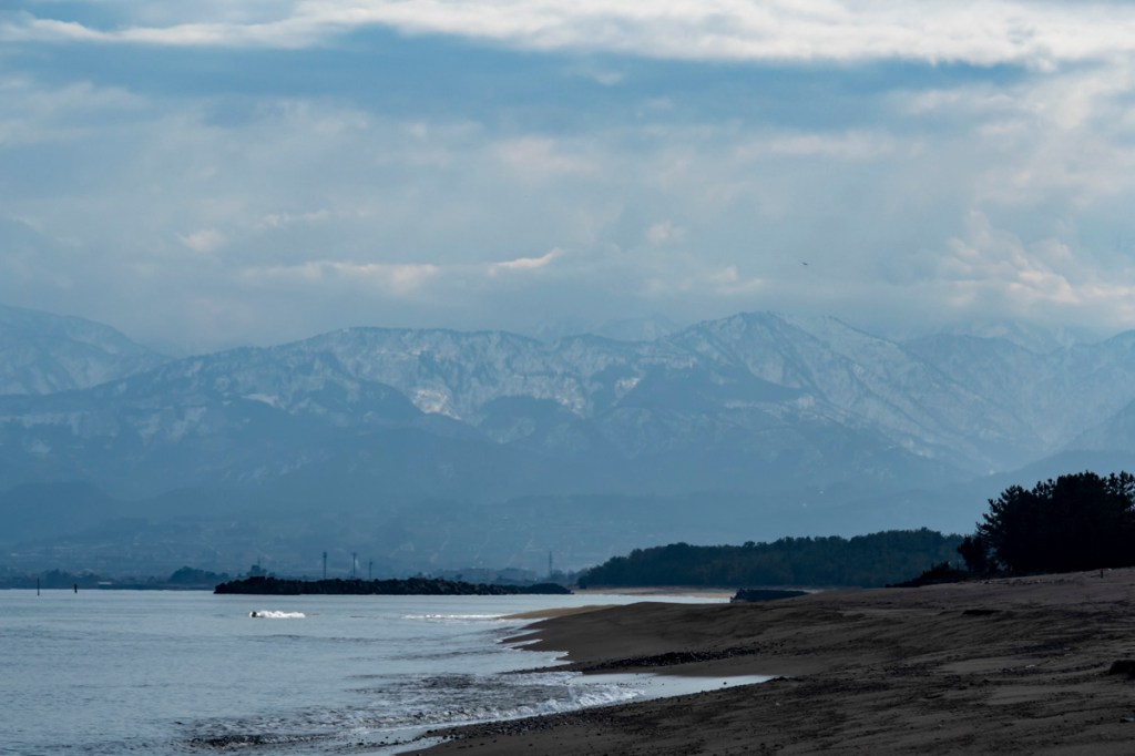 岩瀬浜から見る立山は、雲がかかっているのと逆光気味ということもあってモヤッとしていましたが、人が少ない午前中の海岸線を、気持ちよく散策できました。