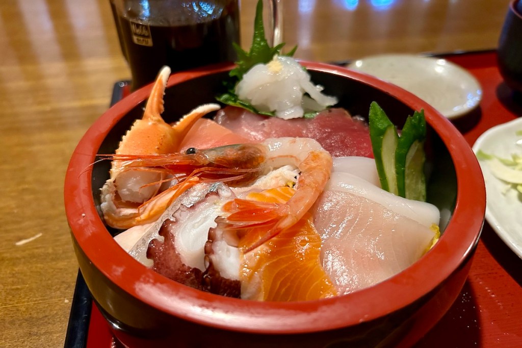 ここはもう、海鮮丼しかないでしょう。酢飯ではなく白米でしたが、個人的にはまったく問題なし。ふつうの醤油と甘口の醤油があったので、前半と後半で変えてみました。