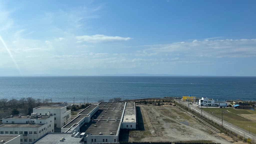 「交流学習室」という名目の展望塔は、魚津の街並みと富山湾、そして湾の向こうの能登半島も見えるという、なかなかの眺望。しかも、このときは私以外に誰もいませんでした。「他には何もない」のも事実ですが、朝の岩瀬浜より立山もよく見えて満足です。