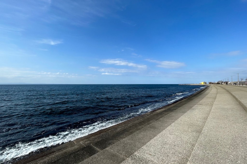 14:00過ぎにありそドームを後にして、海沿いの「しんきろうロード」を歩きます。風はやや強いものの、よく晴れて、ロードバイクに乗る人も何人か見かけました。たしかにこのあたりを自転車で走ったら、気持ちよいでしょうね。