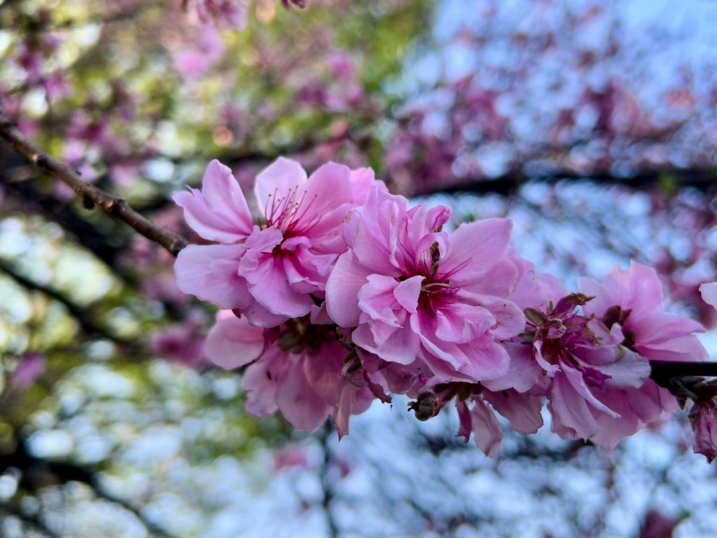 近づいてみれば、見事な寒緋桃(かんひとう、花桃の一種)だった。青い葉も出始めていたから、もう1週あとだったらこんなふうには見られなかったかもしれない。