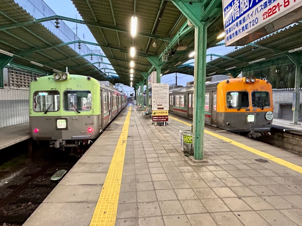 JRの前橋駅からは離れた、いつも人がいない前橋市の中心市街地にある中央前橋駅。切符を購入して改札を通ると、ホームに2本の電車がいました。