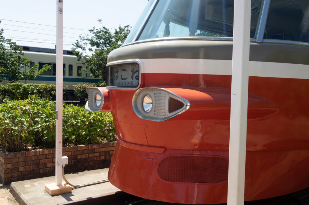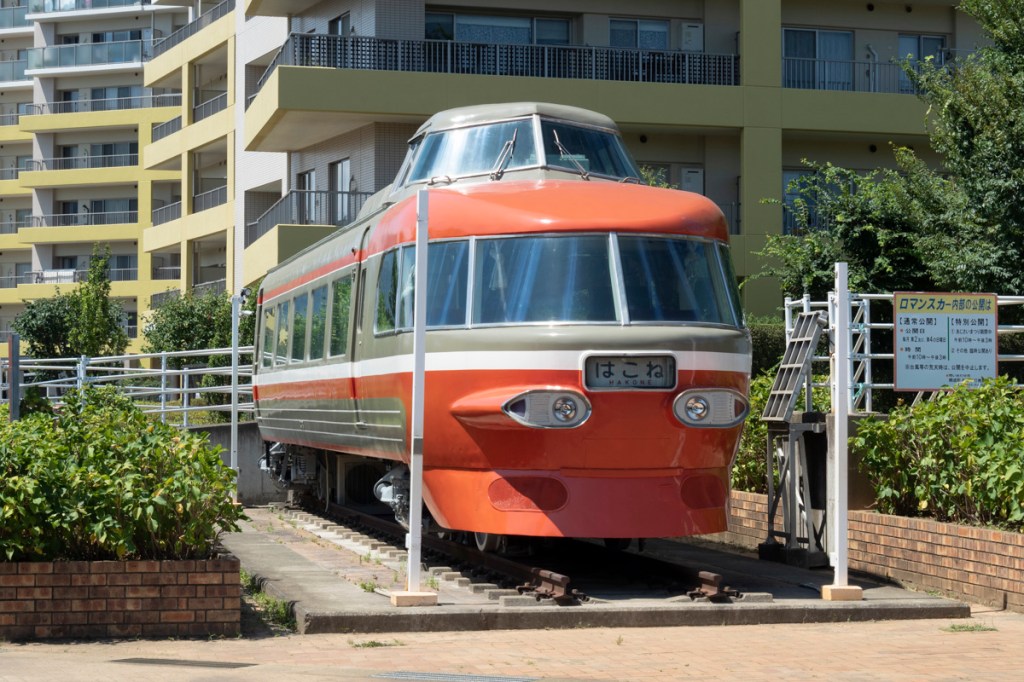 小田急の特急ロマンスカーで初めて展望席を設けたのは、1963年(昭和38年)に登場した3100形NSEです。海老名のロマンスカーミュージアムで保存されていますが、それ以外にも、小田急小田原線・開成駅の駅前にも保存されています。