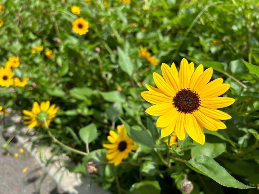 「エコギャラリー新宿」側の芝生広場に面して咲いているのは、小さなヒマワリ「サンビリーバブル」です。