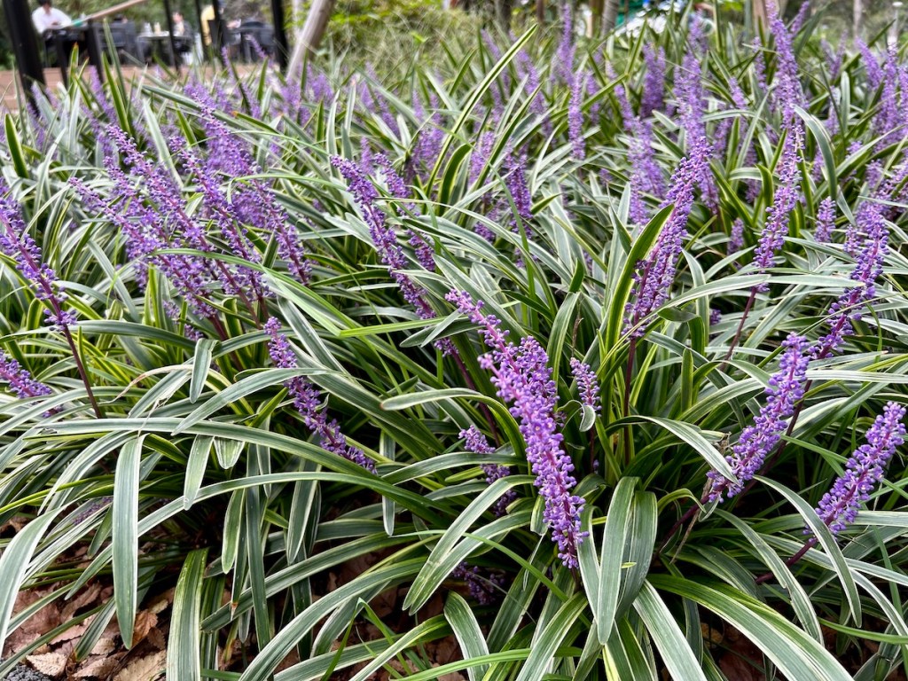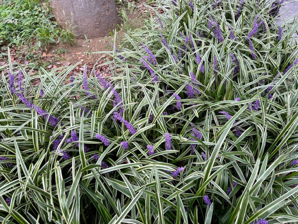 園内の「眺望のもり」では、斑入りヤブランの花の蕾がご覧になれます。 足元を紫色に彩り、美しいですね。