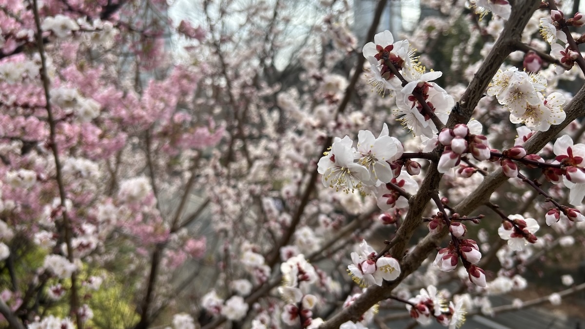 新宿中央公園に咲く花:2月、梅と河津桜。