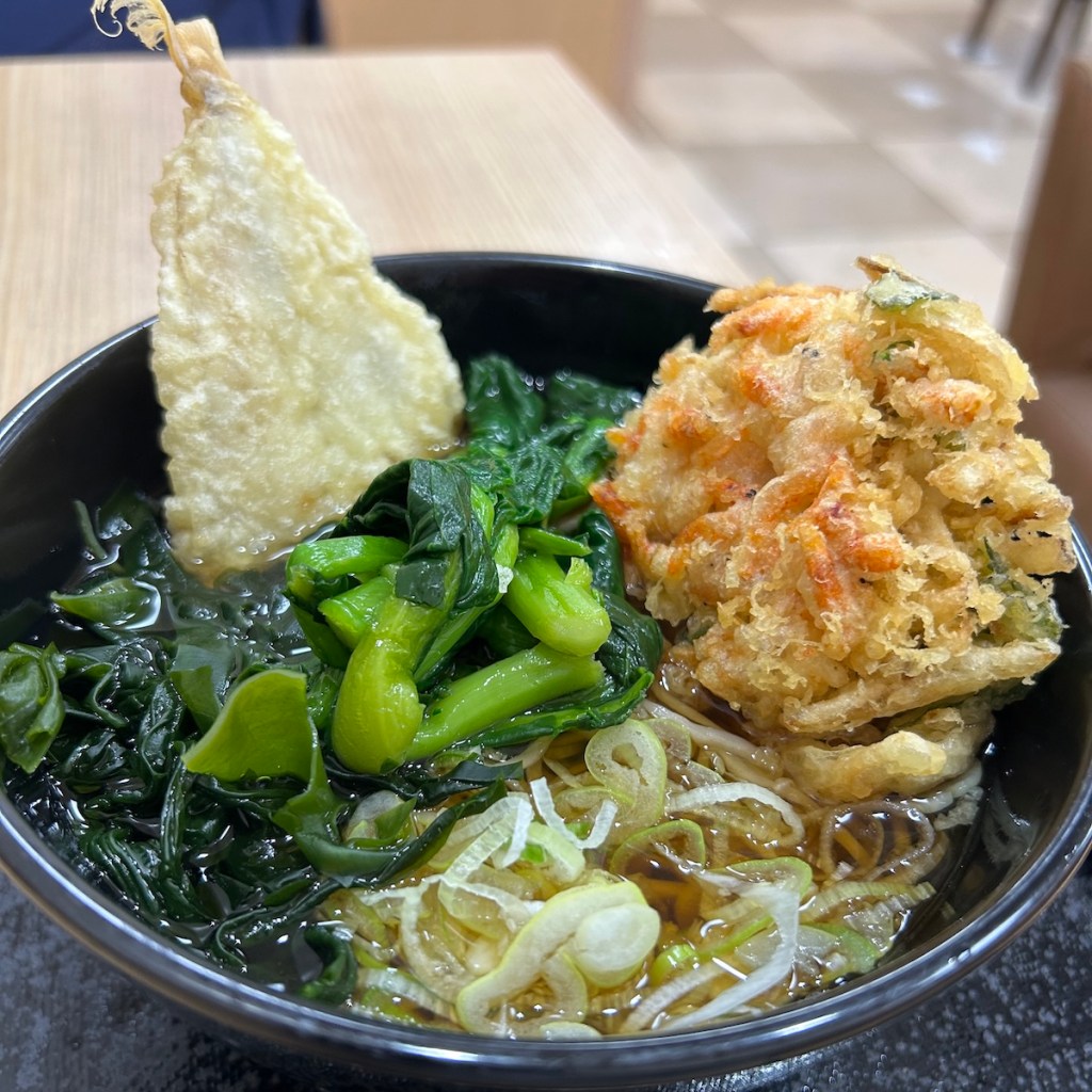 正式なメニューは「生桜海老のミニかき揚げ天とレンコダイ天~菜の花添え~」で、もちろんそばとうどんがあり。おさかなはキスではなく、レンコダイでしたか。