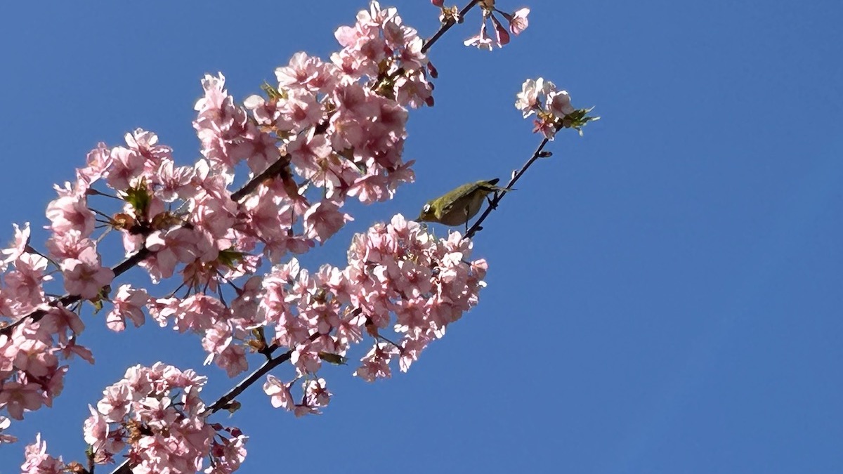 異常な暖かさとなった2024年2月20日に、雨が降り出す前の新宿中央公園で眺めた、梅と河津桜。